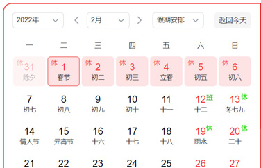 2021-12-272022年元旦和春节放假通知备注: 1、元旦放假三天(1.1-1.3); 2、元旦后第一个周是小休开始(8号上班),第二个周是双休,第三个周本是小休(1月23...更多 -